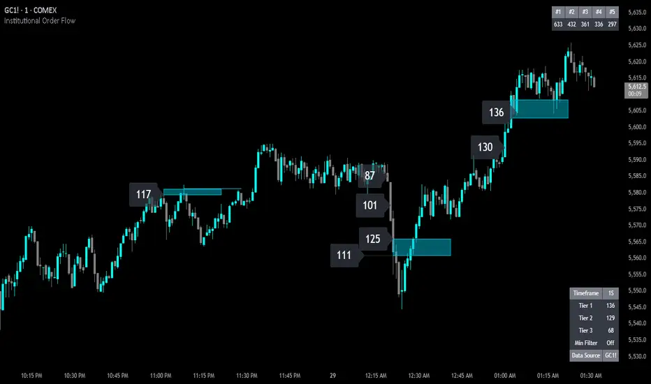 Institutional Order Flow is a specialized indicator designed to detect and visualize significant orders that may represent institutional trading activity. By analyzing granular lower timeframe data within each chart candle, the indicator identifies unusually large orders and displays them directly on your chart as labeled markers, providing insight into where traders with substantial capital have entered or exited the market.