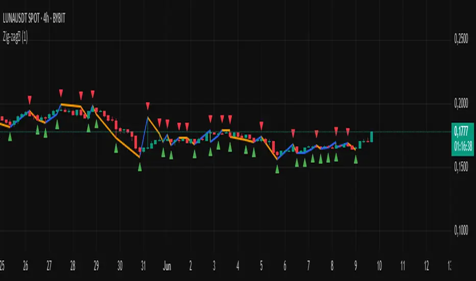 The indicator identifies high and low pivots in the price, connecting them with colored lines — blue for upward trends and orange for downward trends — as if sewing points one by one, revealing the market’s up and down movements.