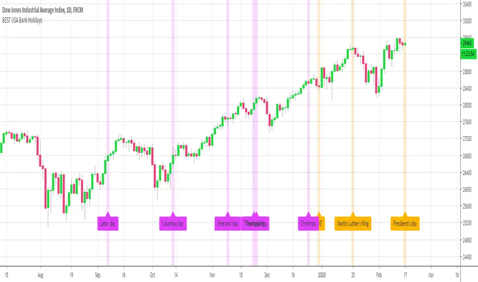 The indicator displays in fuschia (never knew how to write that word properly without checking google first...) the 2019 US bank holidays