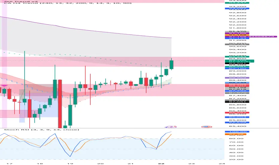 Here is a trend-following strategy I coded for the H4: it first filters the overall direction via the EMA 200, waits for a precise price correction in the recharge zone (between EMA 13 and 32), and only validates the entry if the Stoch RSI confirms an extreme extension (< 10 or > 90) to maximize the chances of a rebound.