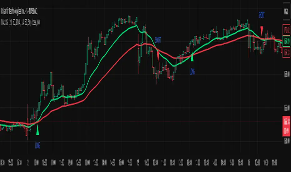 MAxRSI Indicator Marks LONG/SHORT signals from a Moving Average crossover and (optionally) confirms them with RSI. Includes repaint-safe confirmation, optional higher-timeframe (HTF) smoothing, bar coloring, and alert conditions.