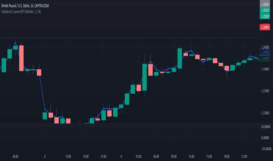 Due to how the Median Calculation works, changing the 'candle timeframe' in options will have no effect - that is available as an option for some of the more traditional MA's, which you can toggle between in the settings... it can also display traditional MA's - SMA, HMA, WMA, and the HLC/3 which I was using up until this point.