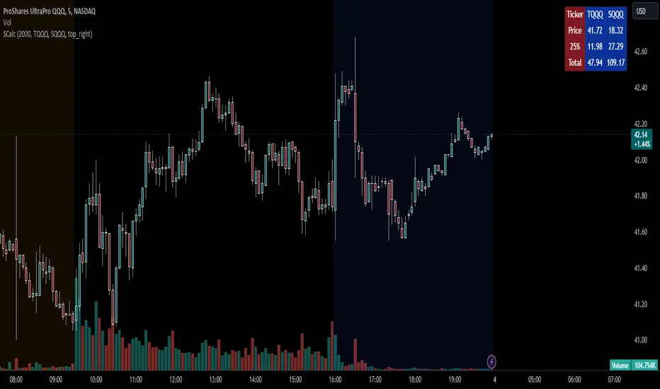This is a simple grid box that will calculate the number of total shares you can trade on two different stocks based on a principal amount you enter in the settings. The indicator updates throughout the trading day as price changes. The 25% column tells you the number of shares you can "scale into" the trade, 1/4 at a time, up to the total number of shares below.