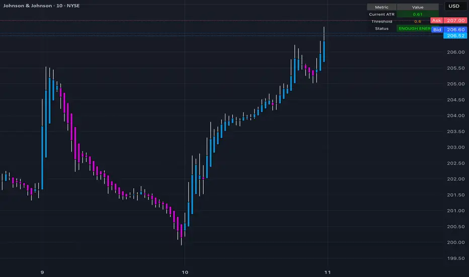 This ATR Energy Table indicator is one of the simplest yet most powerful filters you can have on a chart when trading short-dated or 0DTE options or swing trades on any timeframe from 1-minute up to 4-hour. Its entire job is to answer the single most important question in intraday and swing trading: “Does the underlying actually have enough short-term explosive energy right now to make a directional position worth the theta and the spread, or is this just pretty candles that will die in ten minutes?”