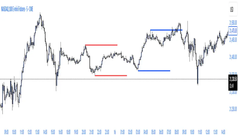 This indicator allows you find London Session and Asia Session highs and lows without marking them yourself. This indicator can also help you find good draws on liquidity for the day and potential highs and lows you can target during that trading day. I recommend trading NQ and ES with this indicator because that's what I seen it work best with. The blue lines are London Session high and low and the red lines are Asia Session high and low. Hope this can save you time marking out your chart before market open.