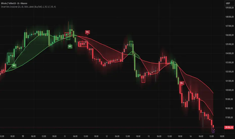 "Smart MA Crossover" is a technical analysis indicator designed to enhance the effectiveness of strategies based on MA crossovers, combining classic moving average crossovers with breakouts from boxes and dynamic trend visualizations. The indicator is fully customizable—you can freely adjust both parameters and graphical elements.
