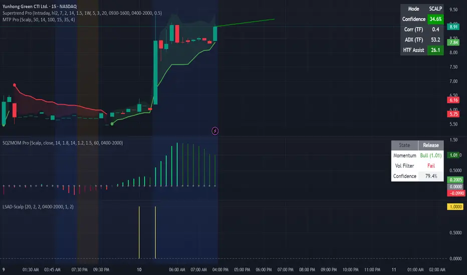 A volatility compression and momentum ignition indicator derived from the TTM Squeeze concept. It detects when volatility “compresses” (squeeze on) and then expands explosively (squeeze off → release).