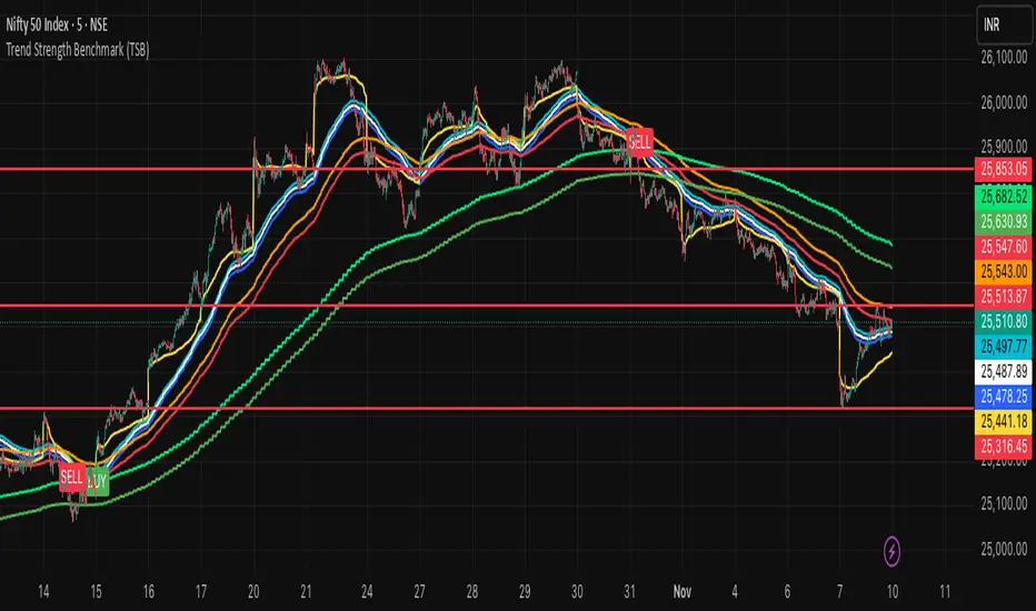For signals, the script fires a BUY when the candle’s low stays above all selected benchmark lines, and a SELL when the candle’s high stays below them. Only one type of signal is allowed at a time, preventing back-to-back buys or sells and keeping the flow clean. An optional ADX filter lets you allow signals only when the trend has enough strength.