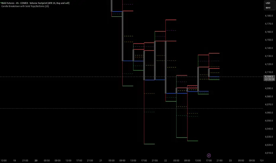 This Pine Script v5 indicator for TradingView, named "Candle Breakdown with Solid Tops/Bottoms," visually dissects each candlestick into four sections: whole candle (low to high), top wick (body top to high), body (open to close), and bottom wick (low to body bottom). For each section, it plots:Solid horizontal lines (width=2) at the top and bottom (e.g., high/low for whole candle, body top/bottom for body).
