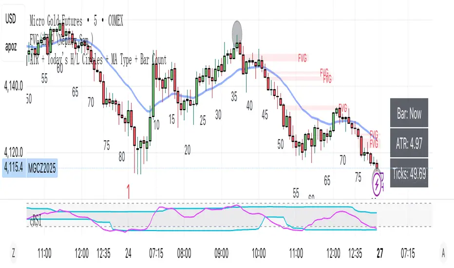 ### ATR + Today's H/L Circles + MA Type + Bar CountThis indicator combines multiple intraday analysis tools into one compact and efficient display. It provides traders with real-time volatility metrics, daily high/low visual cues, configurable moving averages, and per-day bar counting for improved situational awareness.