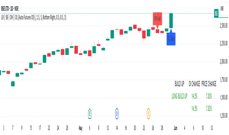 The "LB | SB | OH | OL" indicator is a tool designed to assist traders in analyzing price movements and open interest (OI) changes in FNO markets. This indicator combines various elements to provide insights into long build-up (LB), short build-up (SB), open-high (OH), and open-low (OL) scenarios.
