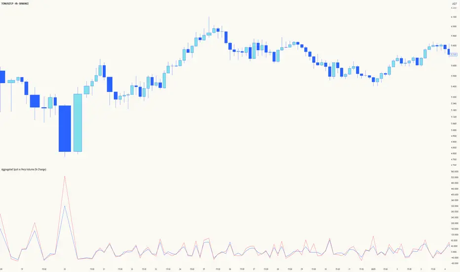 The "Aggregated Spot vs Perp Volume (% Change)" indicator helps crypto traders compare the momentum of spot and perpetual futures (perp) trading volumes across 12 major exchanges. It calculates the percentage change in volume from one bar to the next, highlighting divergences and showing which market—spot or perp—is leading a move. By focusing on relative changes, it eliminates the issue of absolute volume differences, making trends clear.