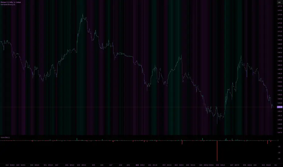 This is a custom Pine Script v5 indicator for TradingView that creates a Market Efficiency Heatmap as a background overlay on your chart. It visualizes how "efficient" the market's price movement is over a specified period—essentially measuring how much of the total price volatility (wiggle room) resulted in net directional progress, weighted with volume activity.