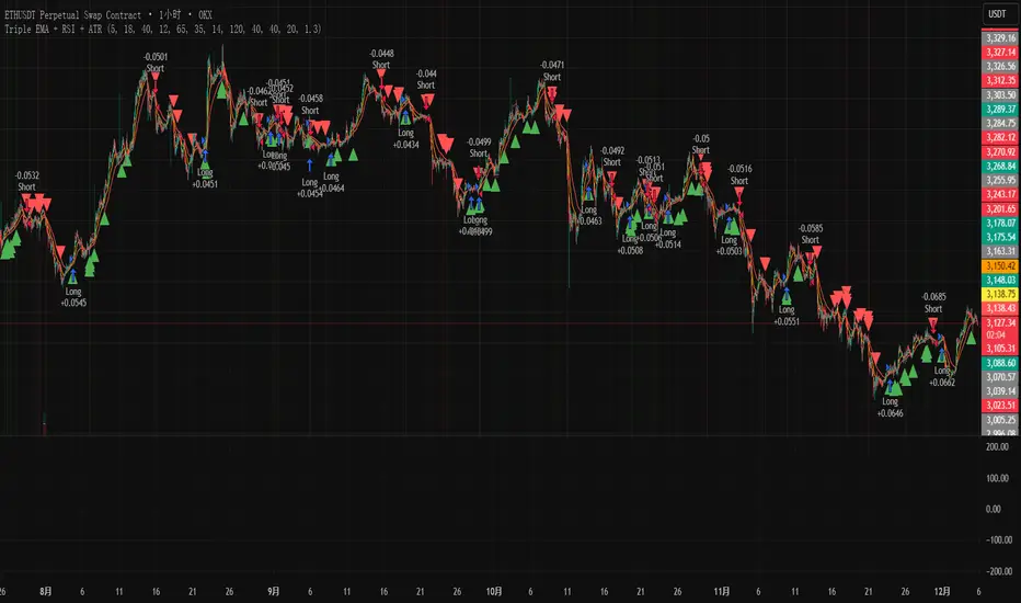 This comprehensive trading system combines triple EMA alignment, RSI momentum filtering, and dynamic ATR-based risk management. The strategy enters positions only when fast, medium, and slow EMAs align in proper order (bullish or bearish), confirmed by RSI remaining within defined thresholds (not overbought/oversold) and a volume spike above its moving average. Exits are managed intelligently using a multi-tier approach: a fixed stop-loss based on ATR, a first profit target at a predefined risk-reward ratio, and a trailing stop that activates after reaching a second, higher profit tier. Designed for trend-following with built-in momentum and volume confirmation, it features professional order execution with configurable commission and slippage for realistic backtesting. Visual cues including colored backgrounds and signal shapes enhance chart clarity.
