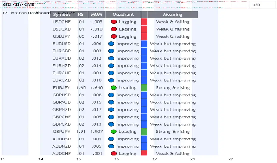 This FX Rotation Dashboard indicator offers a clear, at-a-glance overview of the relative strength and momentum of major FX pairs when measured against the US Dollar Index (DXY). It helps identify which currency pairs are leading or lagging in performance and how their relative positioning is evolving over time.