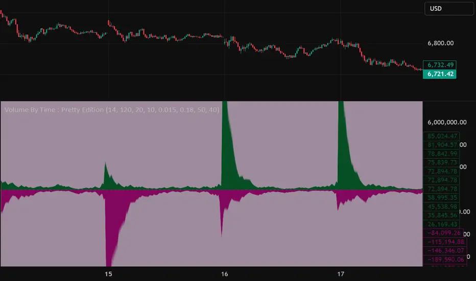 Volume By Time : Pretty Edition visualizes market volume as smooth, flowing ribbons. Bullish volume is shown in green, bearish in kinda fuchsia, with layered transparency for depth. Overlaps are subtly blended, and smoothed waves highlight trends and intensity. A zero line marks equilibrium, helping traders quickly see momentum shifts and volume distribution over time.