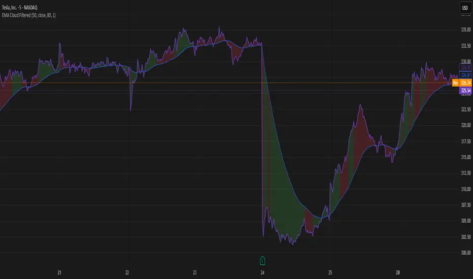 This indicator highlights the relationship between price and EMA with a dynamic color-changing cloud. It uses a customizable noise filter to ignore minor fluctuations, helping traders focus on meaningful momentum shifts. Cloud color adapts based on whether the price is above or below the EMA and whether the gap is widening or tightening, making trend strength and potential reversals easier to interpret.