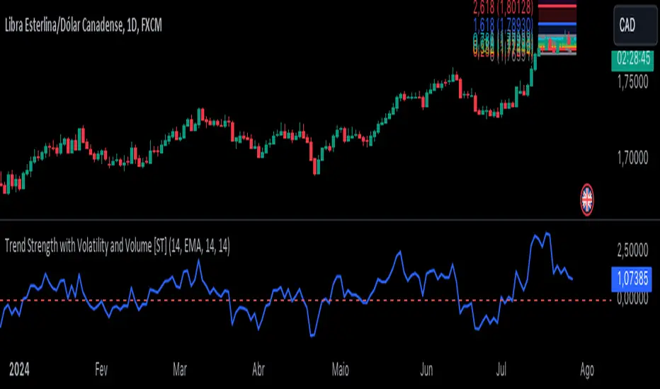 Este indicador combina a volatilidade do mercado, medida pelo ATR (Average True Range), e o volume de negociações para medir a força da tendência atual. Ele ajuda a identificar quando a tendência está ganhando ou perdendo força.