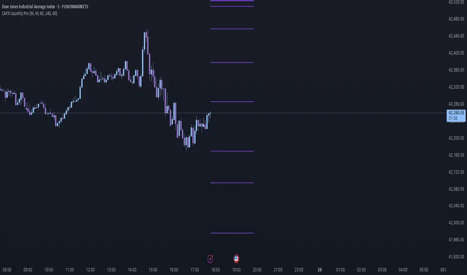 Whether you're scalping, day trading, or swing trading, the CAFX Liquidity Pro provides clear visual cues that simplify your decision-making process and enhance your trade management. With a focus on precision and reliability, it helps you avoid emotional exits and instead base your take profits on real market behavior and liquidity dynamics.