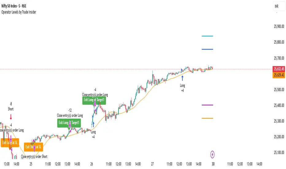 Operator Levels by Trade Insider is a breakout trading strategy designed for intraday trading on the Nifty 50 index using a 5-minute timeframe. It identifies high-probability trade setups based on the first 5-minute candle’s price range of the day, generating target levels for long and short positions. The strategy uses a customizable Simple Moving Average (SMA) for trend filtering and a strict 1:1.5 risk-to-reward validation, making it ideal for intraday traders in the Indian equity market.