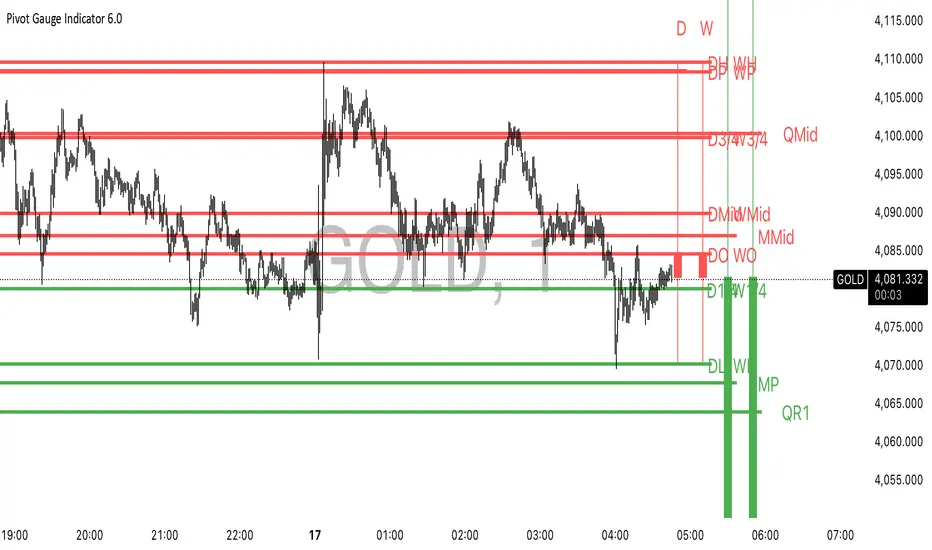 This “Pivot Gauge” is a multi-timeframe map of key levels. It pulls in four higher timeframes (by default: Daily, Weekly, Monthly, Quarterly) and draws their candles to the right of your chart, plus all important reference lines: open, high, low, previous high/low, mid, 25%/75% levels, and classic floor pivots (P, S1–S3, R1–R3). Levels above price are red, under price are green. You can toggle which timeframes and level types to see, customize line width and style, and add round-number grids. The script also fires alerts whenever price crosses any selected level, so you always know when price is interacting with levels.