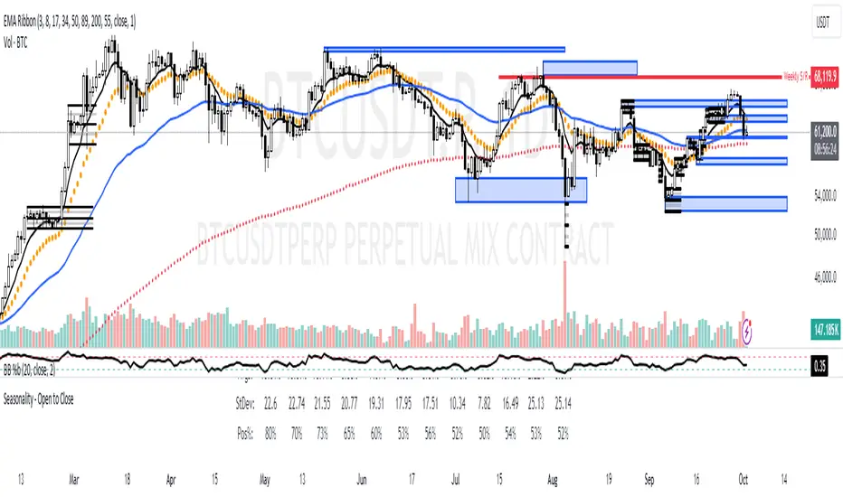 This Pine Script is designed to visualise **seasonality** in the financial markets by calculating the **open-to-close percentage change** for each month of a selected asset. It creates a **heatmap** table to display the monthly performance over multiple years. The script provides detailed statistical summaries, including: