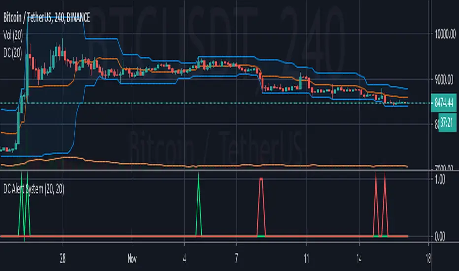 This simple indicator prints a green alert when the close price crosses above the upper band of the DC, and a red alert when the price crosses the lower band of the DC.