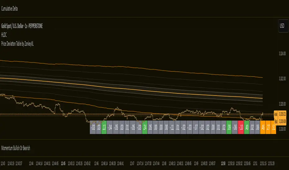 Provides a 30 column table showing price deviation per bar close, highlighting larger deviations in red (downside) or green (upside).