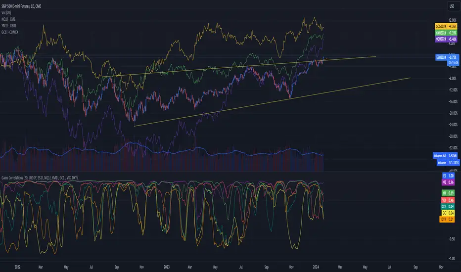 Originality & Usefulness: The script functions by tying 7 major indexes together using correlation strength relative to the currently selected ticker. The user can change the tickers and also invert if needed. This is different from the single correlation script by adding in several as they track in tandem. The chart used is to illustrate periods where correlations are tight with equities and the lines are clustered towards the top range of strong covariance. It also highlights when Equities are far out of line with others like gold (GC). A loose covariance would mean the relationship is weak and this indicator would show a divergence in price action between them. The overall intent is to show that most indexes rise and fall together but sometimes they move faster together.