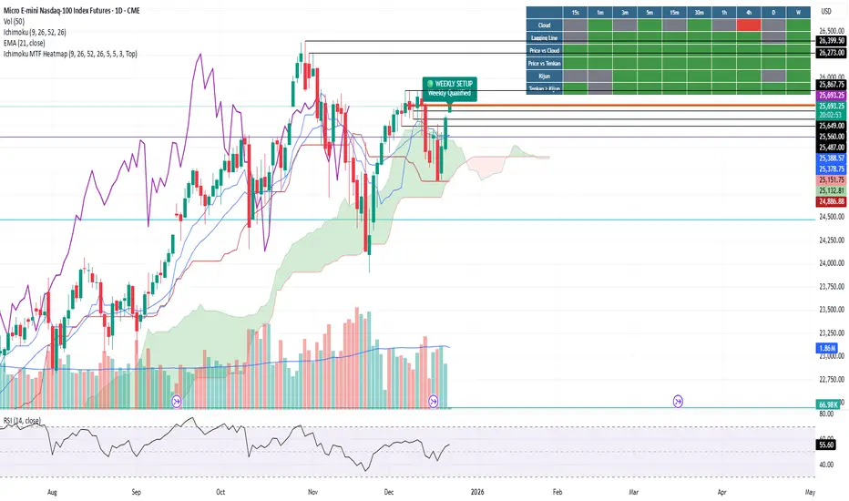 This is a version of the Ichimoku Cloud Heatmap but adds a can't miss alert when it meets Daily and Weekly conditions. The cloud metric is still being refined and the qualifier is ignoring just the cloud for now. As of 12/21/2025 GLD is meeting the conditions to set this flag.