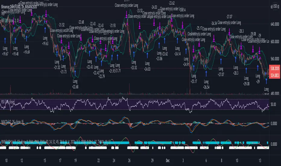 My first published work! I took a few concepts I found in other scripts, tweaked them to match what I had in mind, added some ideas of my own and then added 3commas hooks. Essentially this script is a variable MACD indicator with linear regression and a lot of curve smoothing. It will buy and sell like any other MACD indicator, though it won't exactly match the MACD line you will see on regular MACD indicators due to the smoothing and linear regression. The stop loss should prevent the biggest losses though you will still lose some rounds as this is very aggressive. The parameters I have set up here work best for BNB however feel free to experiment with other coins. The linear regression is set high by default which is what I've found works best for BNB/USD.
