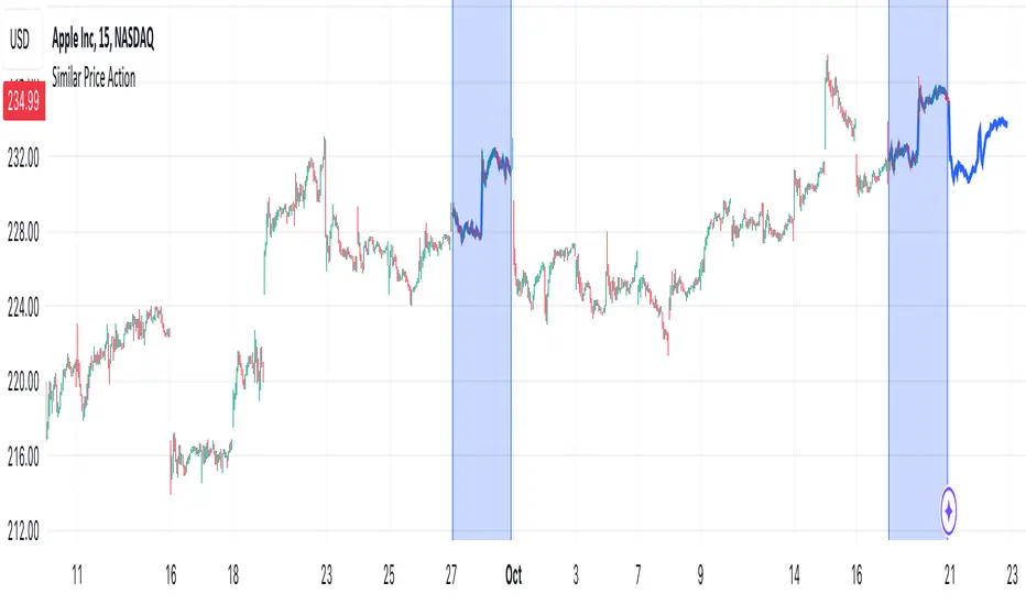 The indicator tries to find an area of N candles in history that has the most similar price action to the latest N candles. The maximum search distance is limited to 5000 candles. It works by calculating a coefficient for each candle and comparing it with the coefficient of the latest candle, thus searching for two closest values. The indicator highlights the latest N candles, as well as the most similar area found in the past, and also tries to predict future price based on the latest price and price directly after the most similar area that was found in the past.