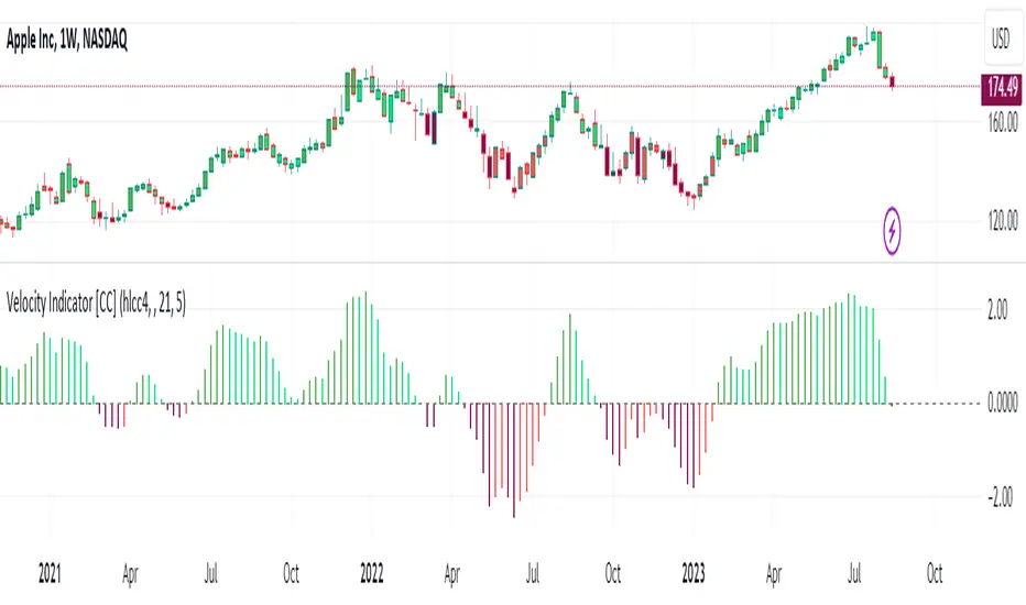 The Velocity Indicator was created by Scott Cong (Stocks and Commodities Sep 2023, pgs 8-15). This is my variation of his formula designed to capture the overall velocity of the underlying stock by applying the typical velocity formula. This indicator is visually similar to a typical stochastic indicator but uses a different underlying calculation. This works well as a momentum indicator, and the values are completely unbounded, so the best ways to determine bullish or bearish trends is either by using a crossover or crossunder between the indicator and the midline or to buy or sell the indicator when it reaches a high or low point and starts to fall or rise respectively. For my default version, I used the zero line to help determine the bullish or bearish trends. I have also included multiple colors to differentiate between very strong signals and normal signals, so very strong signals are darker in color, and normal signals use lighter colors. Buy when the line turns green and sell when it turns red.