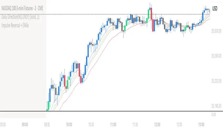 When all EMAs align and the impulsive color signal appears, it visually identifies high-probability reversal or continuation zones on the chart.