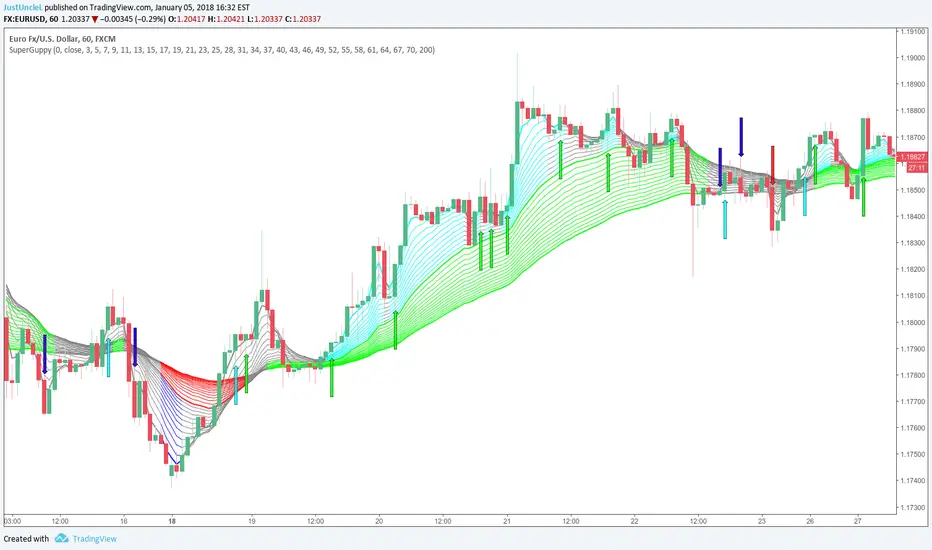 This indicator is a Super Guppy version of standard Guppy GMMA as used in "CM_GUPPY_EMA Revised R2 by JustUncleL". Guppy MAs are designed to capture the inferred behaviour of traders and investors by using two groups of averages.