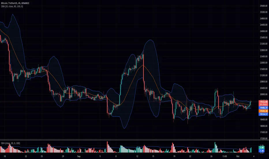 This version of Bollinger Bands measures the average volatility. By taking the 75th percentile of the average absolute value of the difference between the Source and the Mean divided by the Standard Deviation and using that as our multiplier for our Bollinger bands we can have a statistically safe trading zone.