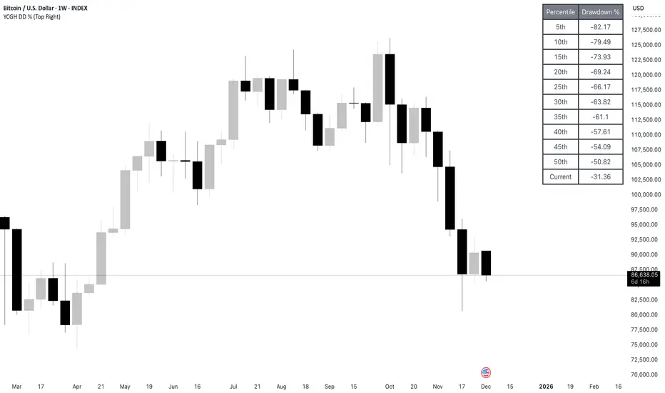 The Drawdown Percentiles indicator tracks how far below the all-time high (ATH) a stock or asset is currently trading, then displays statistical percentiles of historical drawdowns in a customizable table.