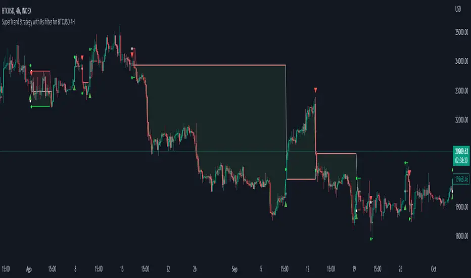 Hello guys!, If you are a swing trader and you are looking for a simple trend strategy, you should check this one. Based in the supertrend indicator, this strategy will help you to catch big movements in BTCUSD 4H and avoid losses as much as possible in consolidated situations of the market