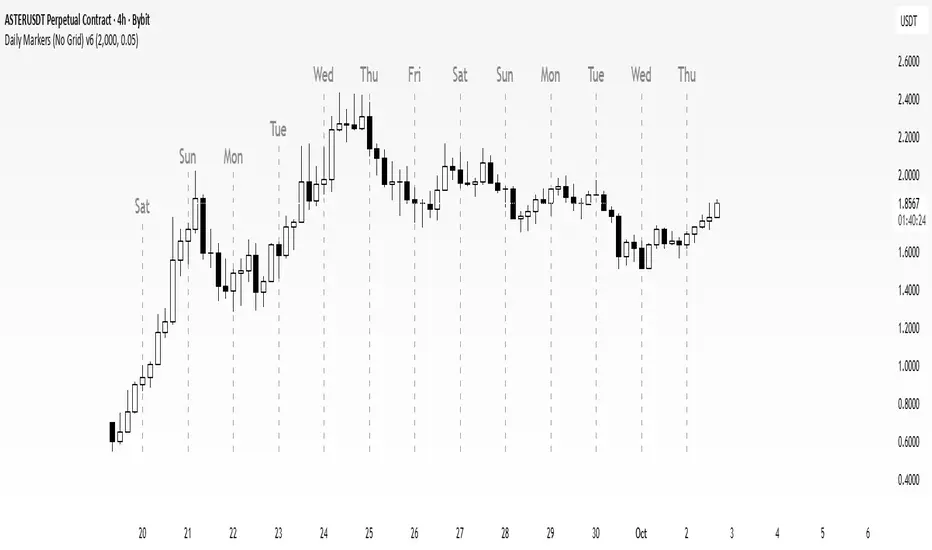 Draws daily vertical markers to visually indicate the beginning of a new day. These can be easily offset for your time zone, or e.g. for the beginning of your trading day.