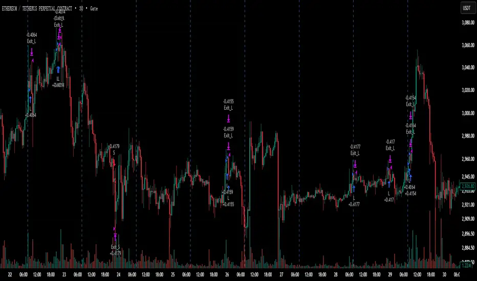 Short Entry (Volatility Explosion): Focuses on momentum. Short entries require high volatility confirmed by ADX (Average Directional Index) and DMI. It looks for a "Bollinger Band Squeeze" release combined with a breakdown below the Lower Rail.