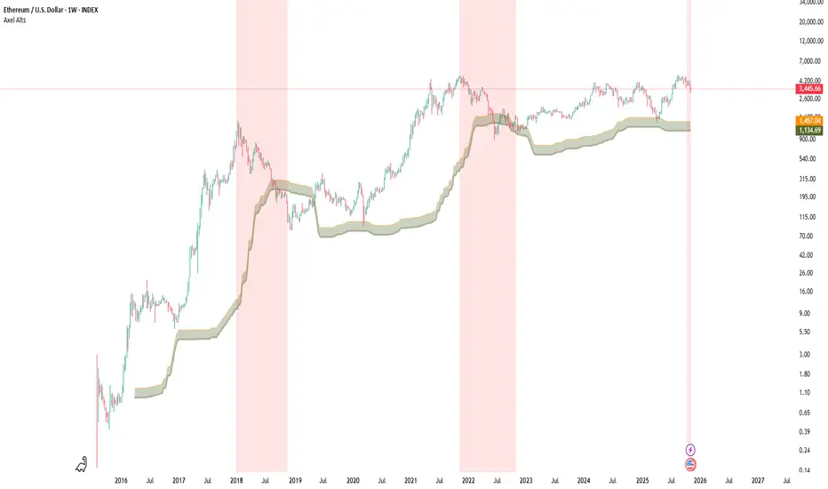 Axel Alts is a higher-timeframe-aware overlay that forms a two-line support band for altcoins using a sticky, threshold-and-step progression. It draws an Upper Support (mid) and a Lower Support (low) derived from evolving local lows, with smoothed transitions and an optional halving-cycle bear-window background.