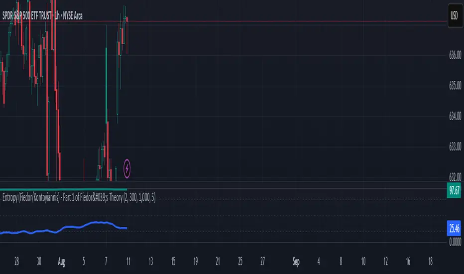 This indicator estimates the Shannon entropy of a price series using a Markov chain model of binary returns, following the approach of Fiedor (2014) and Kontoyiannis (1997).