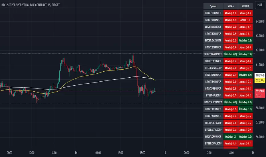 Trend Yönünü Belirleme: İndikatör, seçtiğiniz kripto para çiftlerinin her birinde 50 EMA ve 200 EMA arasındaki ilişkiyi analiz eder. Bu analiz, hem kısa vadeli hem de uzun vadeli trendlerin yönünü belirlemenize olanak tanır.