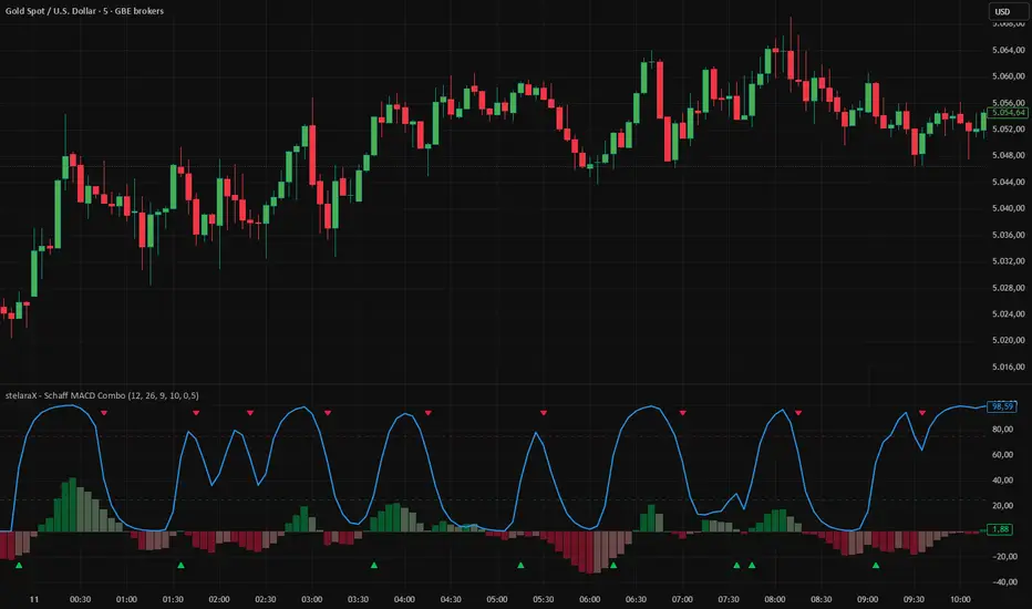 stelaraX – Schaff MACD Combo is a hybrid momentum oscillator designed to combine MACD trend momentum with the faster cycle detection of the Schaff Trend Cycle (STC). It applies an STC-style stochastic smoothing process directly to the MACD histogram to create a responsive signal line that highlights momentum shifts and potential turning points earlier than classic MACD signals.