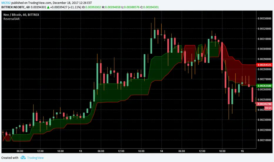 There are two lines, a green SAR line and a red Reversal line. When the bulls are in power, the SAR line acts as a support and is on top, and the Reversal line indicates a bearish reversal when crossed. When the bears are in power, the SAR line acts as a resistance and the Reversal line indicates a bullish reversal when crossed,