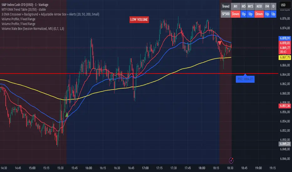 Zeigt in der Mitte des Charts oben das aktuellen Volumen an High Normal und Low der Session