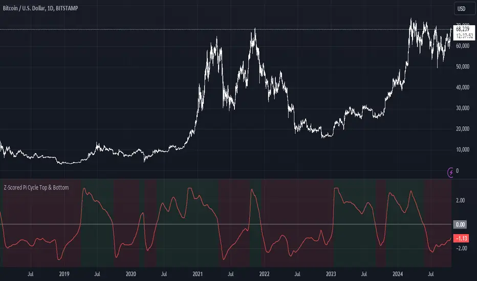 The Z-Scored Pi Cycle Top & Bottom indicator is designed to help traders identify significant market cycle extremes by applying a Z-score to the Pi Cycle Top & Bottom ratio (EMA 111/EMA 350). This normalized score ranges between -2.99 and 2.99, with values near the extremes suggesting potential market tops or bottoms. Green shading indicates a positive Z-score (potential top), while red shading indicates a negative Z-score (potential bottom).