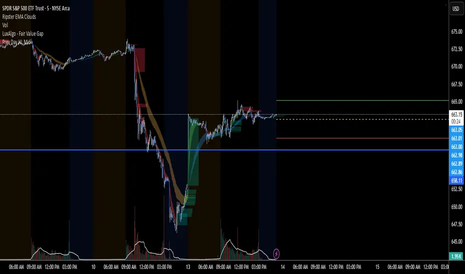 This indicator shows the previous sessions high, low, and midpoint with extended lines for the trading session.