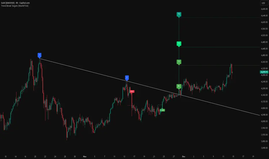 This analysis dissects a confirmed bullish reversal on Gold using a custom Trend Break system. The setup identifies a transition from a bearish corrective phase to bullish momentum, validated by a structural break and a geometric target projection.