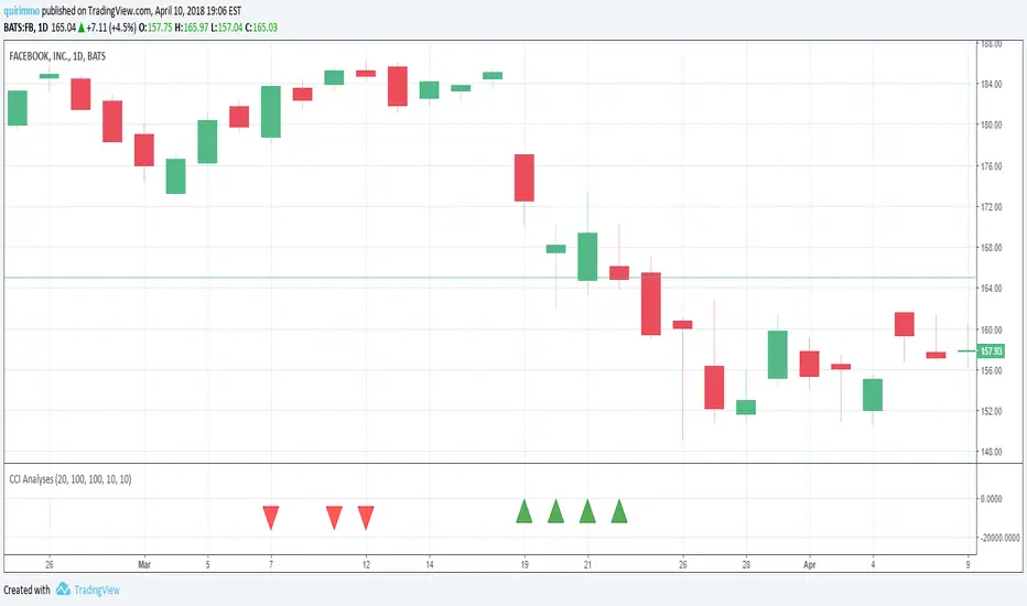This script analyses the CCI indicator values, showing when a fall in price or a rise in price may happen, or when the CCI is confirming the trend.